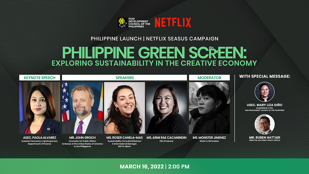 MANILA, PHILIPPINES, MARCH 14, 2022—Netflix, in coordination with the Film Development Council of the Philippines, will be holding a closed-door webinar on sustainable practices in the film and creative industry with the theme “Philippine Green Screen: Exploring Sustainability in the Creative Economy.” The event will be held online on March 16, 2022, and will be attended by the government, members of the local film industry, and the academe.